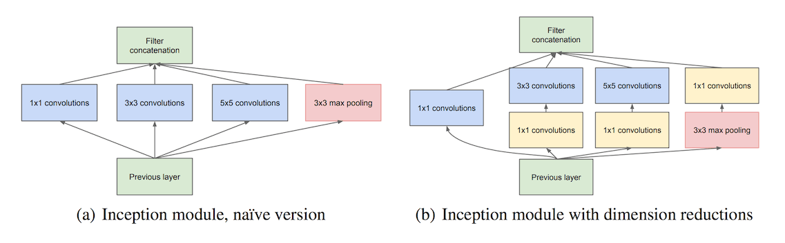 如上图(a)所示,左边就是一个简单的Inception module,对输入层分别使用