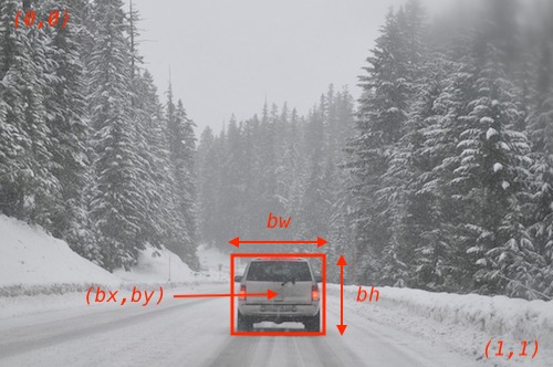 其中 Pc 表示识别为某一类的概率,bx,by,bh,bw 定位该目标,c1,c2,c3 是one-hot形式,表示具体的类别。例如上图中的汽车表示为: