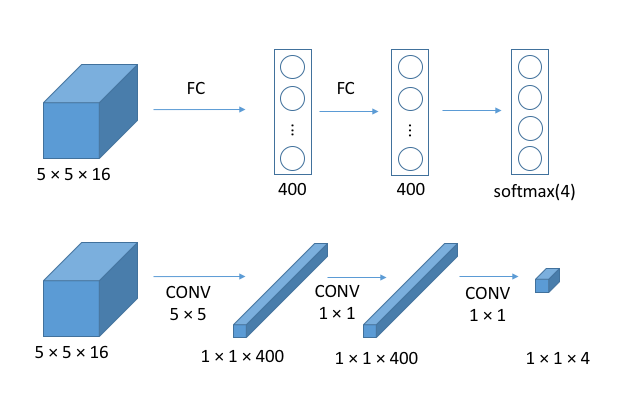 为了在卷积网络中使用滑动窗口,首先要将全连接层转换为卷积层。如图所示: