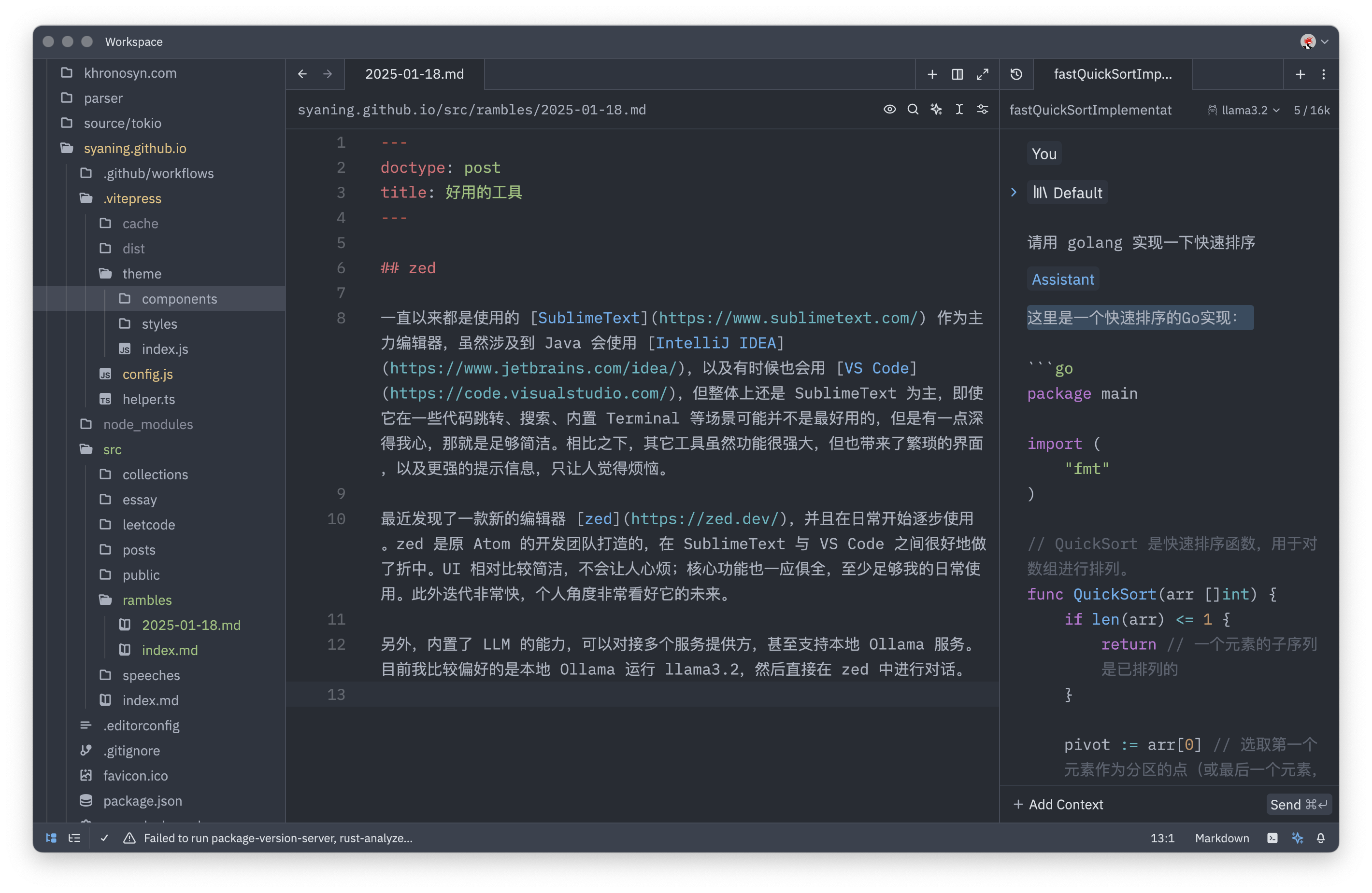 最近发现了一款新的编辑器 zed,并且在日常开始逐步使用。zed 是原 Atom 的开发团队打造的,在 SublimeText 与 VS Code 之间很好地做了折中。UI 相对比较简洁,不会让人心烦;核心功能也一应俱全,至少足够我的日常使用。此外迭代非常快,个人角度非常看好它的未来。
