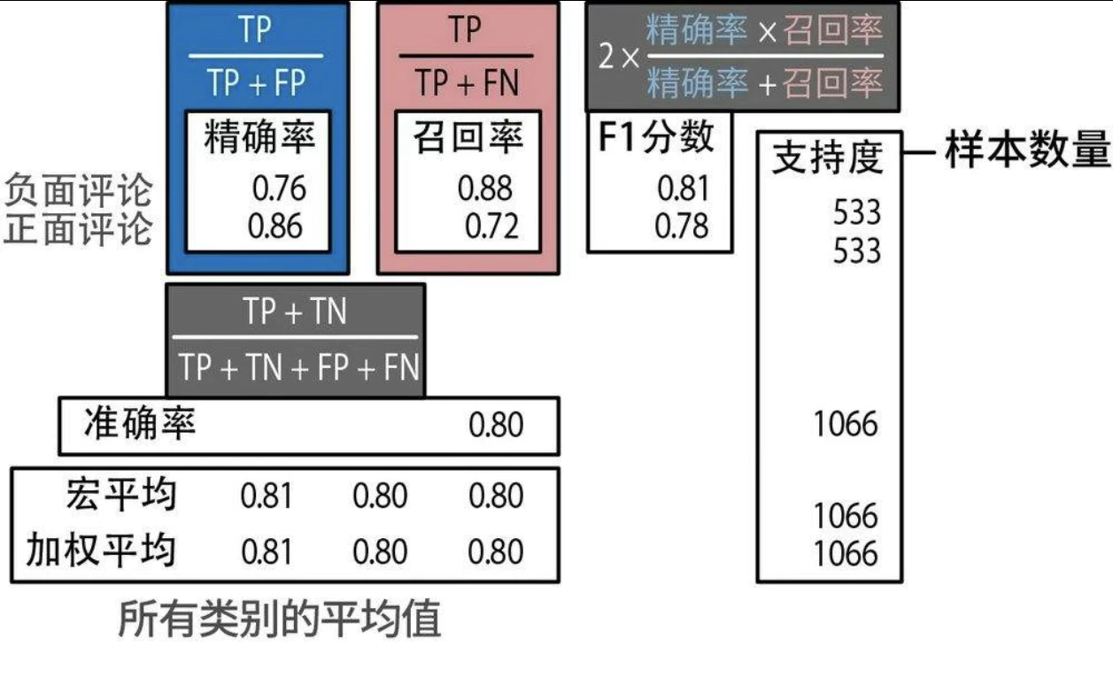 • 准确率(accuracy)指的是模型在所有预测中做出正确预测的比例,用来评估模型的整体准确性。