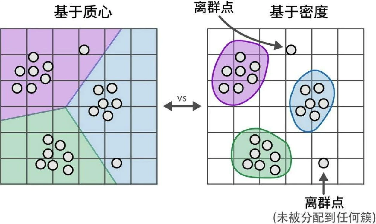 • 基于质心,例如 k-means,需要生成一组预设的簇