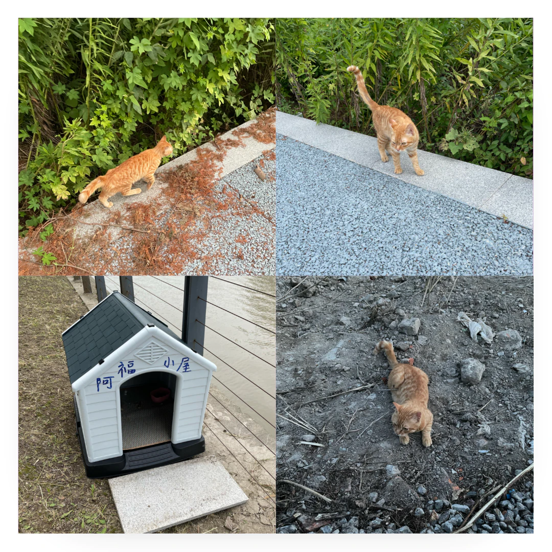 突然有一天,路边的草丛里多了一只瘦瘦的橘猫。刚开始的时候,它躲在草丛里面喵喵地叫着。后来有人拿了食物和清水放在路边。再后来它就经常在路边出现了,有时候是懒洋洋地趴在路边的草荫下睡觉,有时候也和河边散步的人嬉戏,一点也不怕人了。它总是那么瘦瘦的,但是皮毛很干净,一直也比较精神。